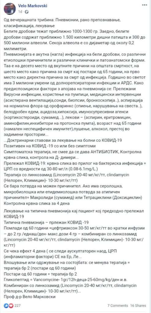 Лекување на типична пневмонија кај пациент кој предходно прележал КОВИД-19