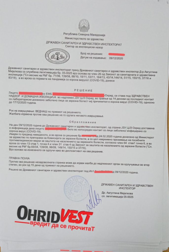 Денес од Државниот Санитарен и здравствен инспекторат им беа доделени решениата на 13 првачиња која изолацијата им трае до 17.12 2020.