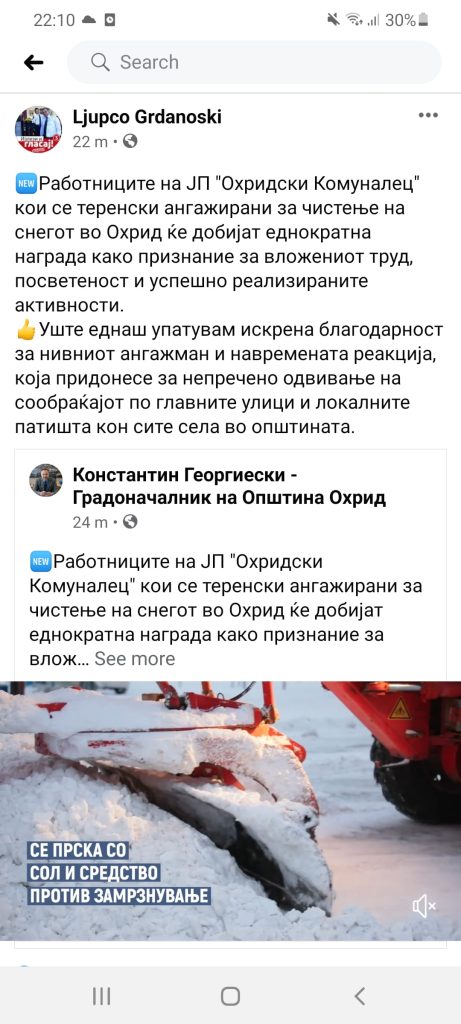 👍Уште еднаш упатувам искрена благодарност за нивниот ангажман и навремената реакција, која придонесе за непречено одвивање на сообраќајот по главните улици и локалните патишта кон сите села во општината.