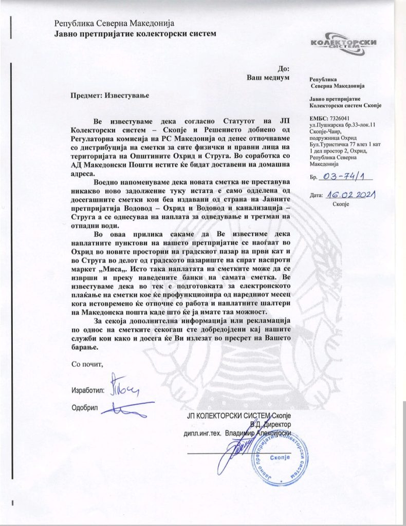ЈП Колекторски систем – Од денес отпочнавме со дистрибуција на сметки