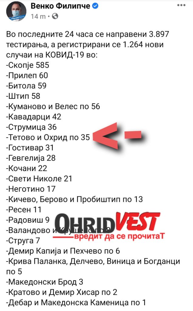 Министерот за здравство Венко Филипче на својата фб страна објави дека во Охрид последбите 24 часа се регистрираби 35 нови случаи на Ковид-19.