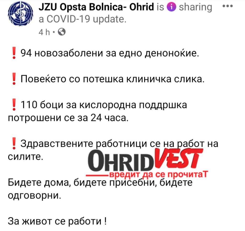 Додекa пак ЈЗУ Општа Болница Охрид кој директор е Горан Балев , објавија дека во Охрид за едно деноноќие новозаболени се 94 лица .