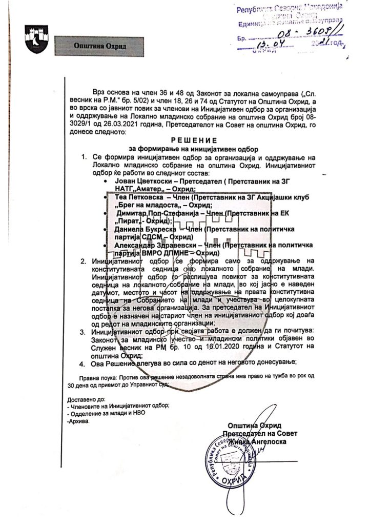 Претседателот на Совет на општина Охрид врз основа на своите законски овластувања донесе решение за формирање на иницијативен одор за организација и оддржување на Локално младинско собрание на општина Охрид. Иницијативниот одбор се формира само за оддржување на конститутивната седница на локалното собрание на млади на општина Охрид.
