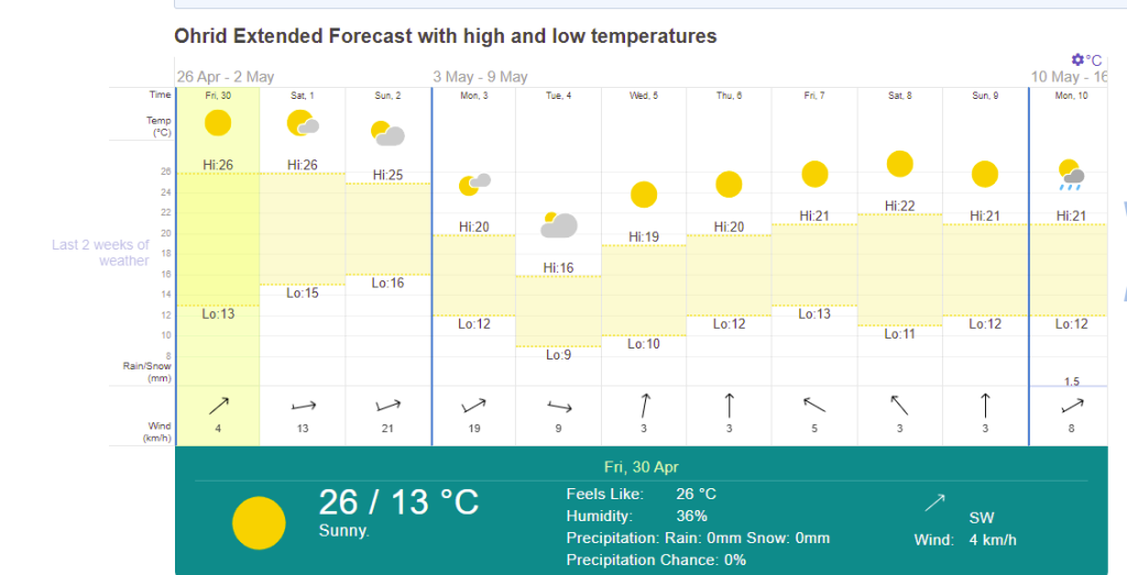 Во Охрид Сончево и топло време ќе преовладува за време на претстојните велигденски и првомајски празници. Минималната температура ќе биде до 9 а Максималната температураќе достигне и до 26 степени.
