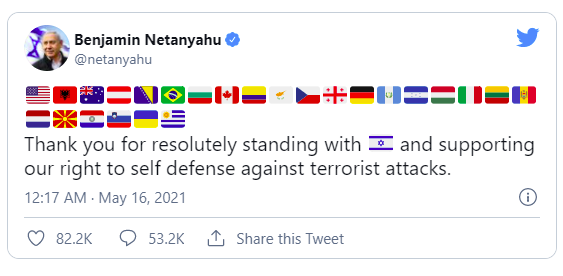 Во меѓувреме, израелскиот премиер Бенјамин Нетанјаху преку Твитер денеска им се заблагодари на земјите кои го поддржаа Израел во последните судири со Палестинците. Меѓу балканските земји, се најде и знамето на Северна Македонија.