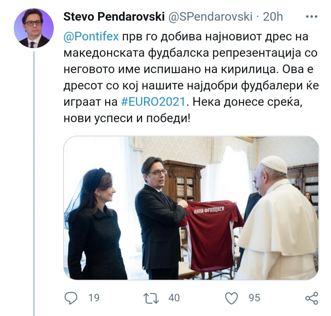 Папата Франциск прв го добива најновиот дрес на македонската фудбалска репрезентација со неговото име испишано на кирилица. Ова е дресот со кој нашите најдобри фудбалери ќе играат на #EURO2021. Нека донесе среќа, нови успеси и победи!