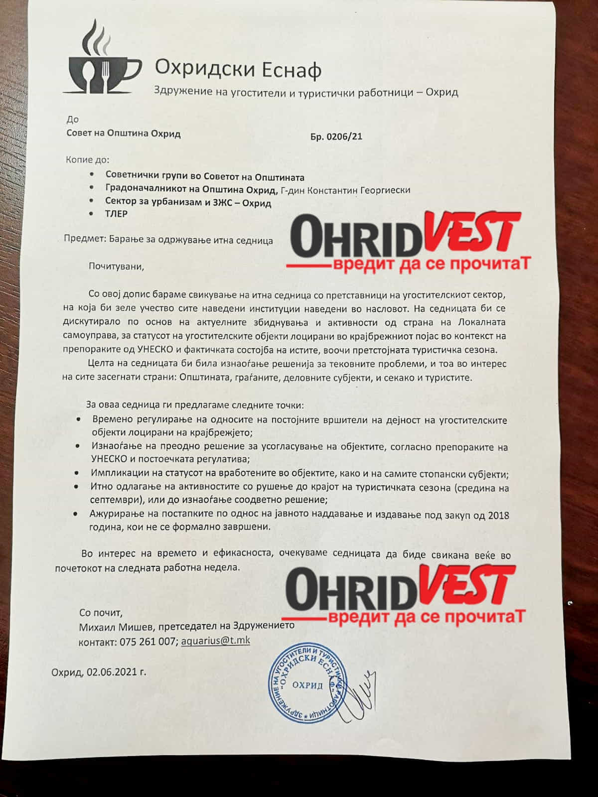 Соопштение на Советот на Општина Охрид во врска со Барањето на Здружението на угостители и туристички работници „Охридски Еснаф“