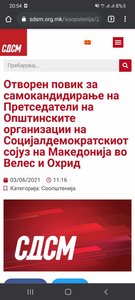 Иако досегашниот претседателот на Сдсм Охрид Лазе Танески тврдеше дека не е разрешен сепак денес СДСМ во официјалната страна објави О Т В О Р Е Н П О В И К за самокандидирање на Претседатели на Општинските организации на Социјалдемократскиот сојуз на Македонија во Велес и Охрид.
