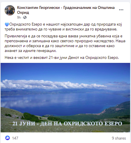 Охридското Езеро е нашиот најскапоцен дар од природата кој треба внимателно да го чуваме и вистински да го вреднуваме.Привилегија е да се поседува една ваква уникатна убавина која е препознаена и запишана како светско природно наследство. Наша должност и обврска е да го заштитиме и да го оставиме како аманет за идните генерации.Нека е честит и вековит 21-ви јуни Денот на Охридското Езеро. – гласи денешниот ф.б статус на градоначалникот Георгиески