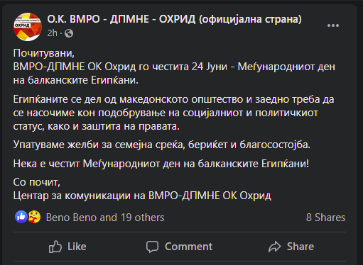 Почитувани,ВМРО-ДПМНЕ ОК Охрид го честита 24 Јуни – Меѓународниот ден на балканските Египќани.Египќаните се дел од македонското општество и заедно треба да се насочиме кон подобрување на социјалниот и политичкиот статус, како и заштита на правата.Упатуваме желби за семејна среќа, бериќет и благосостојба. Нека е честит Меѓународниот ден на балканските Египќани . Со почит,Центар за комуникации на ВМРО-ДПМНЕ ОК Охрид – стои на статусот