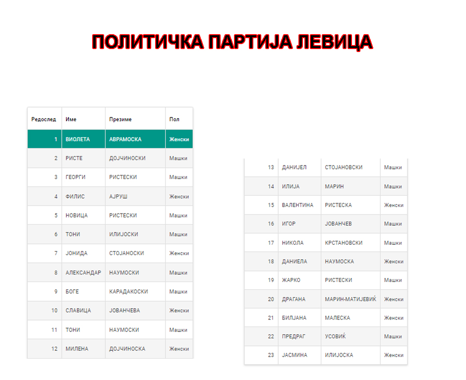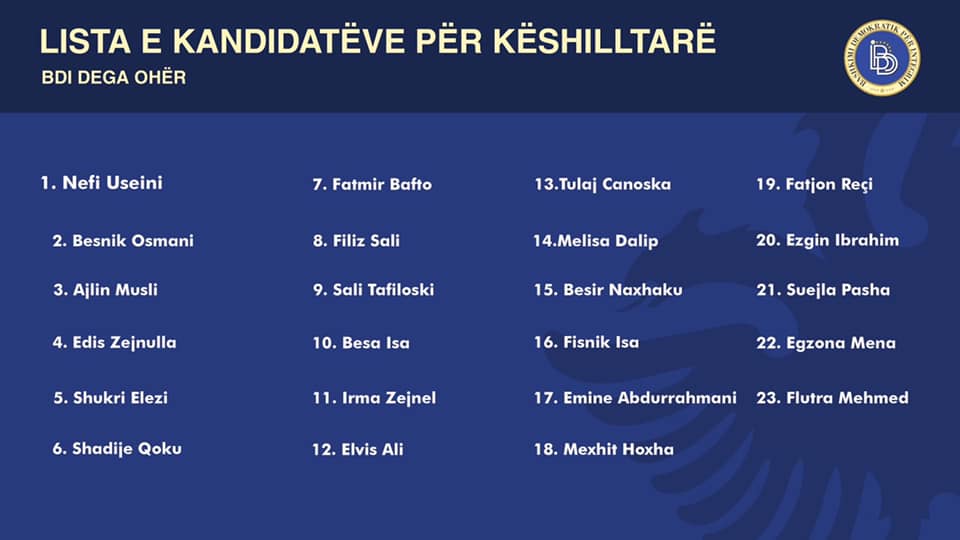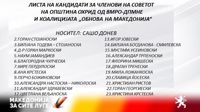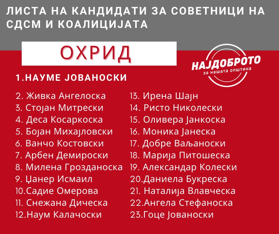 ОВИЕ СЕ ИМИЊАТА НА 253 КАНДИДАТИ ЗА СОВЕТНИЦИ ВО ОХРИДredakcija14/09/2021Охрид СДСМ 2. ВМРО ДПМНЕ 3. ТРАЈНО МАКЕДОНСКО РАДИКАЛНО ОБЕДИНУВАЊЕ – ТМРО 4. Група избирачи Стевче Стевоски 5.ЕДИНСТВЕНА МАКЕДОНИЈА 6.ДВИЖЕЊЕ ОДЛУЧНО ЗА ПРОМЕНИ 7. ГРУПА ИЗБИРАЧИ ДИМИТАР ВЕЛЈАНОСКИ 8. ПОЛИТИЧКА ПАРТИЈА ЛЕВИЦА 9. БЕСА 10. Група избирачи Антонио Наумоски 11. ДУИ