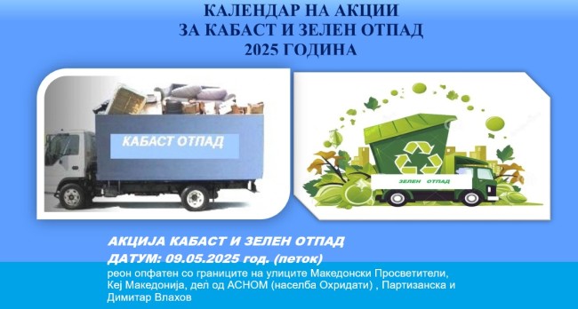 Ј.П.„Охридски Kомуналец” на ден 09.05.2025 год. (петок) ќе организира акција за подигнување кабаст отпад (стар мебел, душеци, телевизори, шпорети, теписони и др.) и зелен отпад (зелен отпад од уредување на дворни површини и градини) од реонот опфатен со границите на улиците Македонски Просветители, Партизанска, Димитар Влахов, Кеј Македонија и населба Охридати