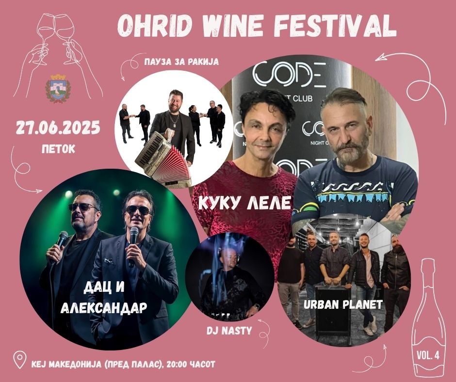 Богата музичка програма и неповтoрлива забава за охриѓани и туристите ќе донесе четвртото издание на Ohrid Wine Festival кој ќе се одржува од 26-ти до 28-ми јуни во Охрид, на Кеј Македонија, пред хотел „Палас“.