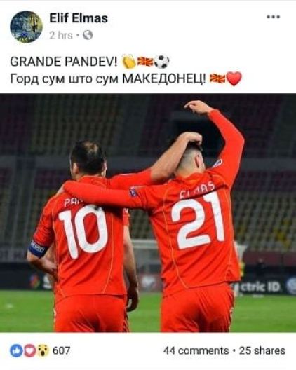 По вчерашниот натпревар против Летонија, Елмас денеска испрати порака преку својот Фејсбук профил, посветувајќи ја победата за капитенот Горан Пандев, но и со голема желба и љубов за својата земја нагласи дека е горд што е Македонец и дел од овој тим.