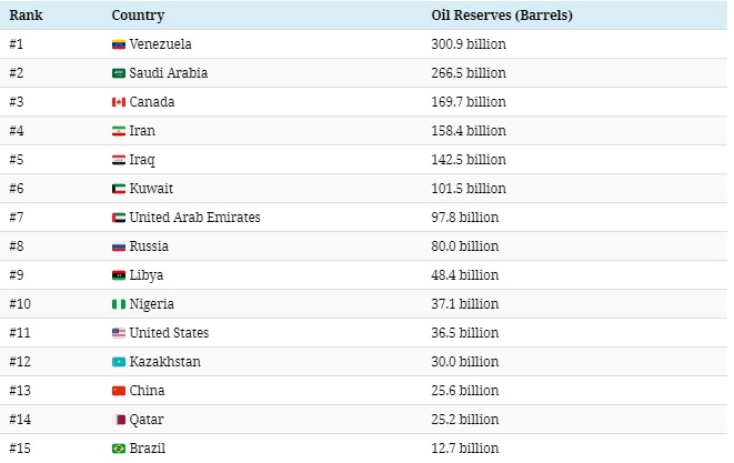Саудиска Арабија, земја позната по својата нафтена доминација, го зазема второто место со 266,5 милијарди барели нафта. Во меѓувреме, Канада и САД се наоѓаат на трето (169,7 милијарди барели) и 11-то место(36,5 милијарди барели).