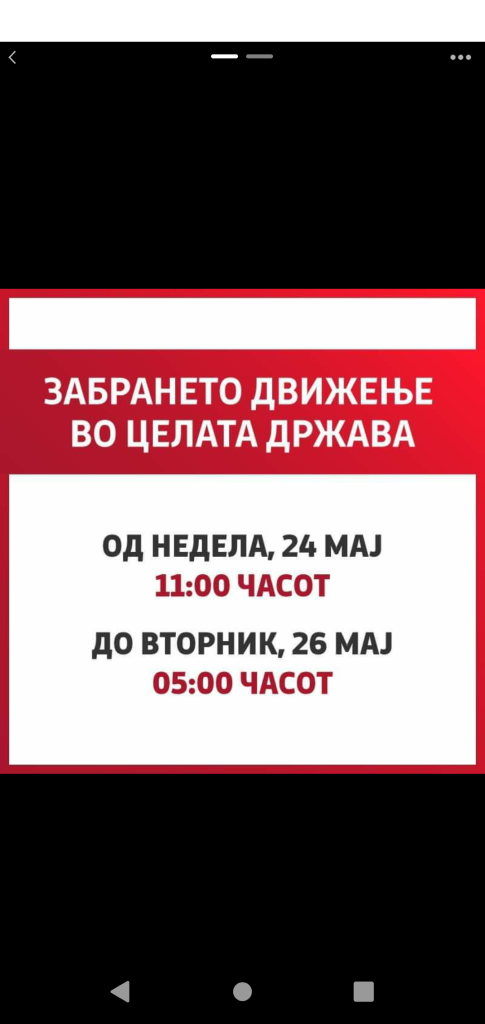Се забранува движењето на сите граѓани на целата територија на државата почнувајќи од недела, 24 мај, во 11:00 часот до вторник, 26 мај, до 05:00 часот.