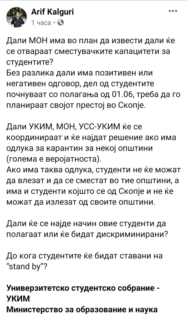 Дали УКИМ, МОН, УСС-УКИМ ќе се координираат и ќе најдат решение ако има одлука за карантин за некој општини (голема е веројатноста).