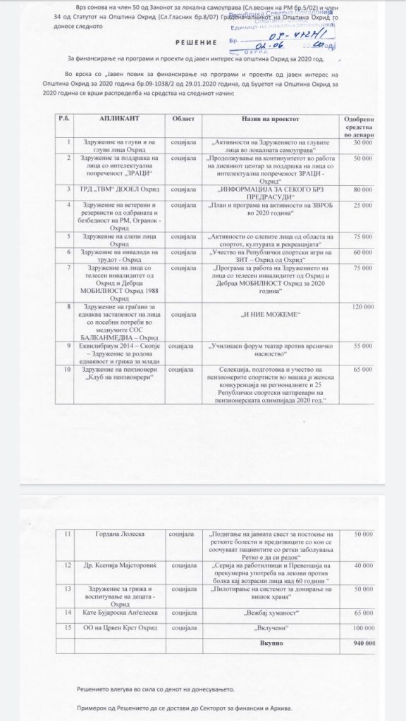 Во врска со „Јавен повик за финансирање на програми и проекти од јавен интерес за Општина Охрид за 2020 година“ , бр. 09-1038/2 од 29,01 2020 година, од Буџетот наОпштина Охрид за 2020 година се врши распределба на средства на следниов начин: