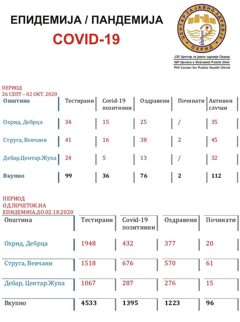 -лабораториски е дијагностицирано присуство на COVID-19 кај вкупно 1395 лица во општините Охрид, Дебрца, Струга, Вевчани, Дебар и Центар Жупа, од кои кај 432 лица во општина Охрид и Дебрца, 676 лице во општина Струга и Вевчани и 287 лица во општина Дебар и Центар Жупа.